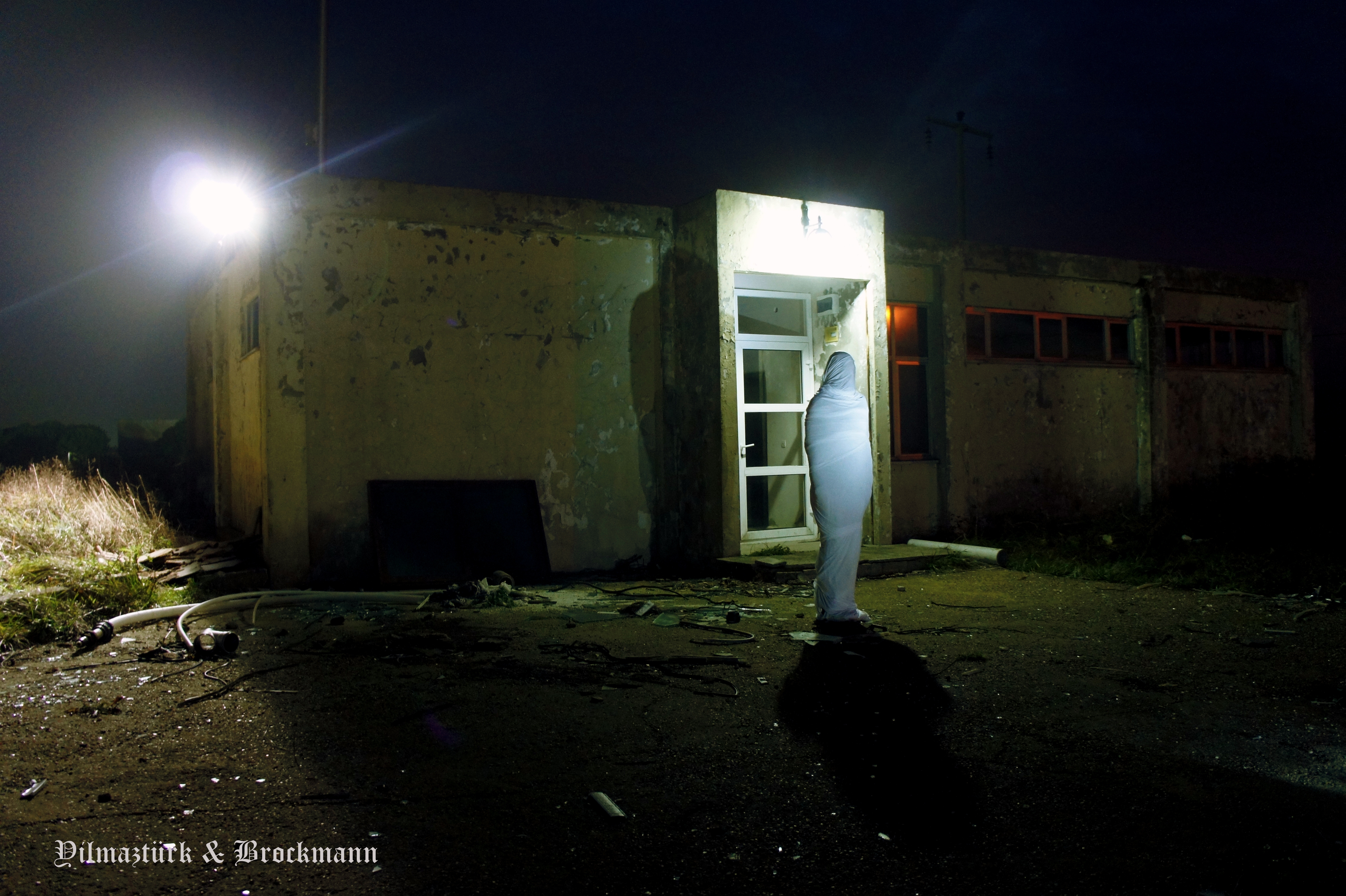 In December 2012 we worked at the Mimar Sinan Fine Arts University in Istanbul and saw a protest in the cafeteria where students start to burn some objects to call attention to the political situation. A short time later we were working on the outskirts of Istanbul and far away from the tourist paradises and we recognize what was meant by this protest at the university. At this moment the idea for the King Nothing staging was born. A white fabric that is used in Turkish society as a shroud build the material for a temporary sculpture and we create the shape of a mummy by wrapping the male body in front of the urban background for a critical statement of the prevailing conditions in the country.